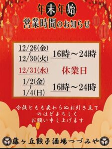 藤が丘餃子工房つづみや 年末年始も元気いっぱいに営業いたします! @藤が丘/餃子/居酒屋/中華